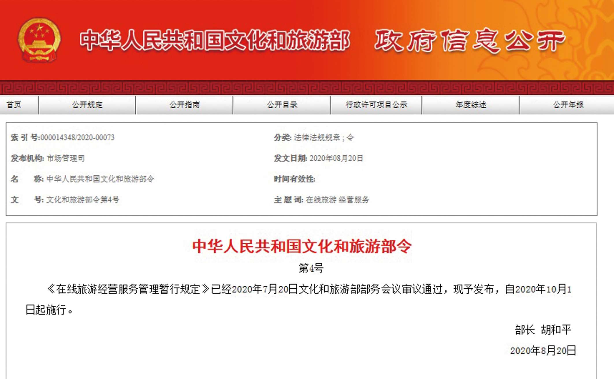 文化和旅游部官网近日发布《在线旅游经营服务管理暂行规定》