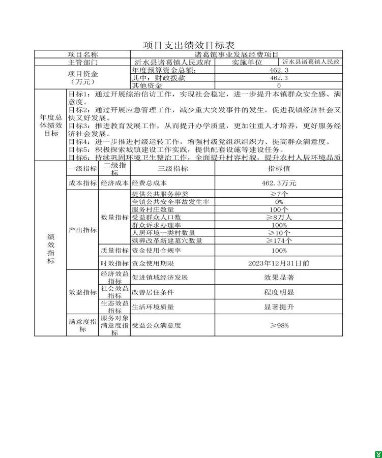 沂水县诸葛镇人民政府2023年项目支出全面实施绩效目标管理,涉及预算项目支出1个,预算资金462.3万元,其中财政拨款462.3万元。