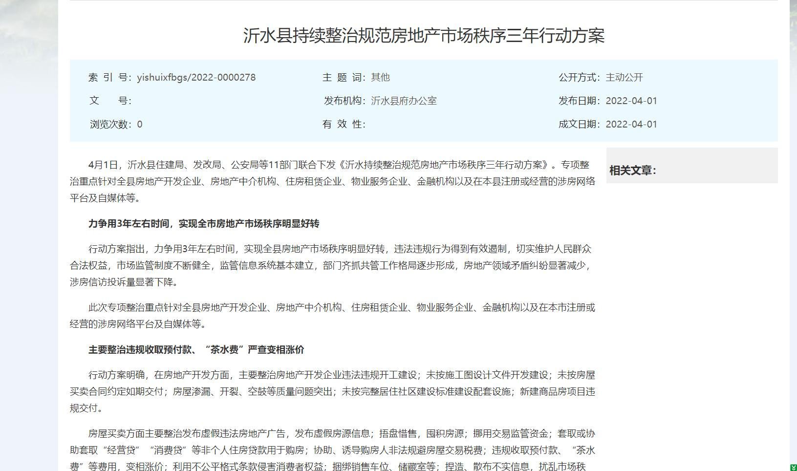 4月1日,沂水县住建局、发改局、公安局等11部门联合下发《沂水持续整治规范房地产市场秩序三年行动方案》。专项整治重点针对全县房地产开发企业、房地产中介机构、住房租赁企业、物业服务企业、金融机构以及在本县注册或经营的涉房网络平台及自媒体等。